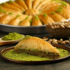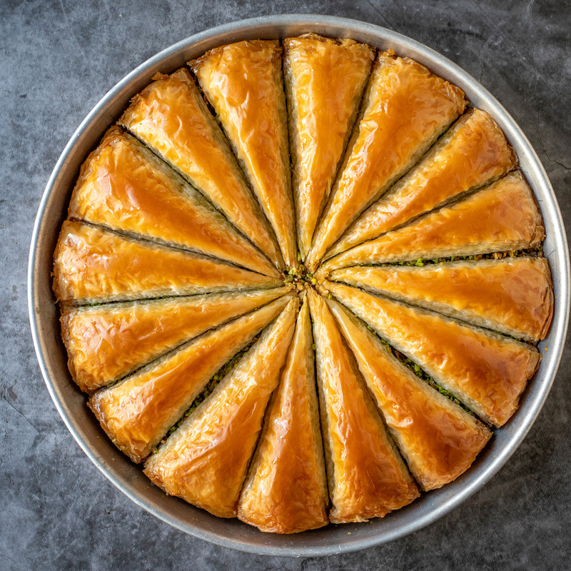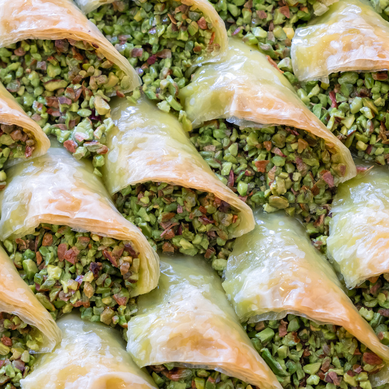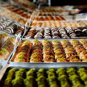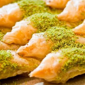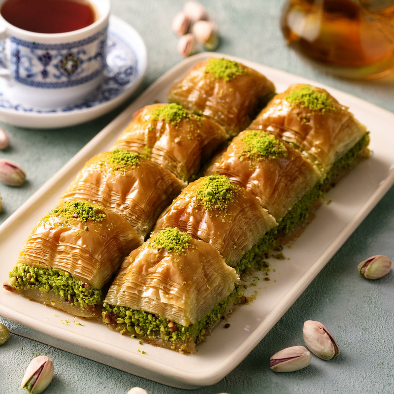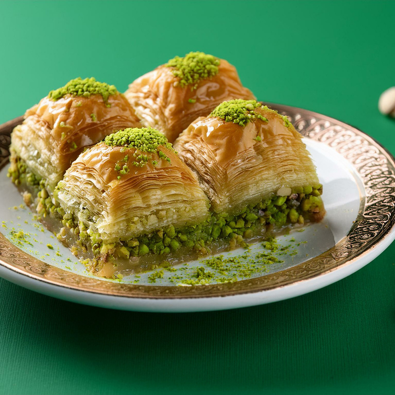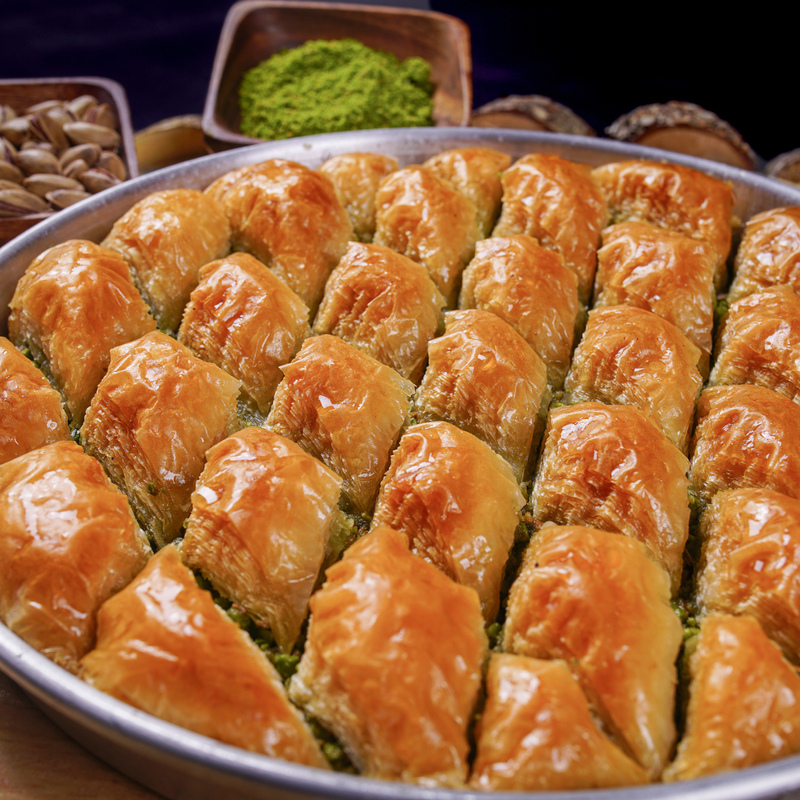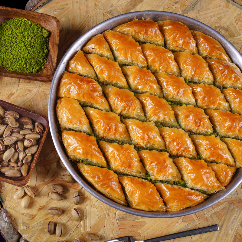 Baklava ist eine typisch türkische Süßspeise hergestellt aus vielen hauchdünnen Schichten Teigblätter, Butter, Zuckersirup und Nüssen (meist Pistazien, aber auch Walnüsse oder Haselnüsse). Der Begriff Baklava kommt aus dem Türkischen und hat Verwandtschaft zum mongolischen Begriff für „Wickeln”. Es ist Gang und Gebe bei freudigen Anlässen wie Hochzeiten, Geburten oder religiösen Festlichkeiten Baklava an Freunde, Bekannte und Nachbarn zu verteilen.